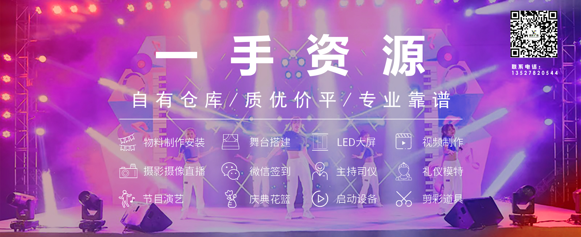 廣州贏彩廣告有限公司是一家集燈光音響,led大屏幕,直播錄播等活動av設備租賃及技術支持以及舞臺結構搭建和物料制作的公司。在客戶中擁有良好的口碑,與國內各文藝團體保持良好的合作關系。本公司成功舉辦了眾多大型年會,商業發布會,網紅直播會,醫學直播大會,電影發布會,派對,大型會議,t臺秀,音樂節,開業慶典、剪彩、揭幕、揭牌、奠基儀式、大型演出等。及樓宇開盤、頒獎儀式、周年慶典晚會、簽約儀式、新聞發布會...